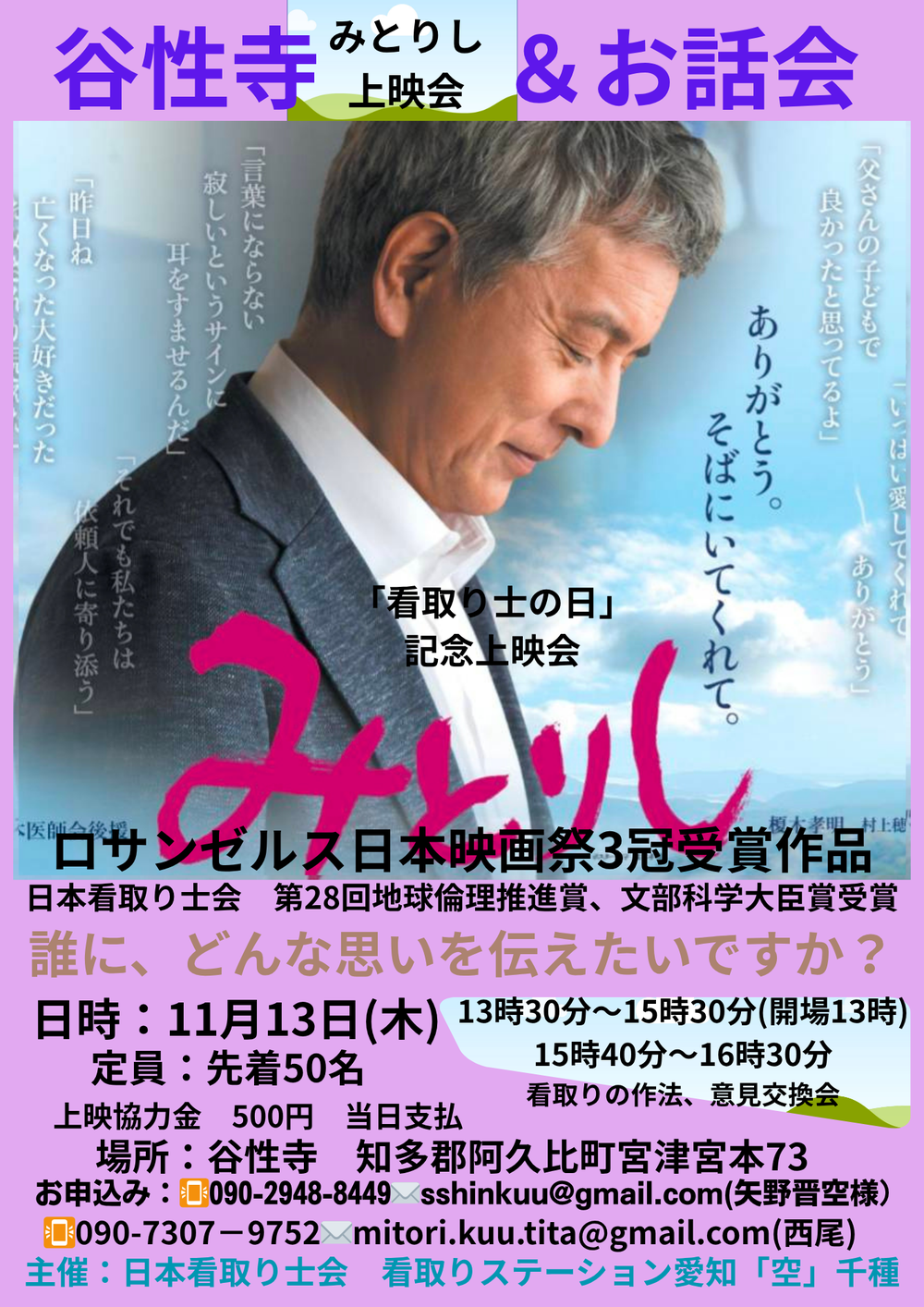 お申込みはこちらより「みとりし上映会予約」として氏名・人数・携帯番号(念の為)をお送り下さい。